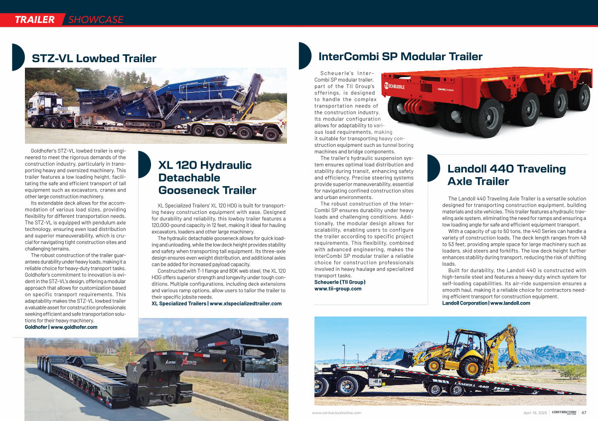 XL Specialized Trailers’ XL 120 HDG is built for transporting heavy construction equipment with ease. Designed for durability and reliability, this lowboy trailer features a 120,000-pound capacity in 12 feet, making it ideal for hauling excavators, loaders and other large machinery.