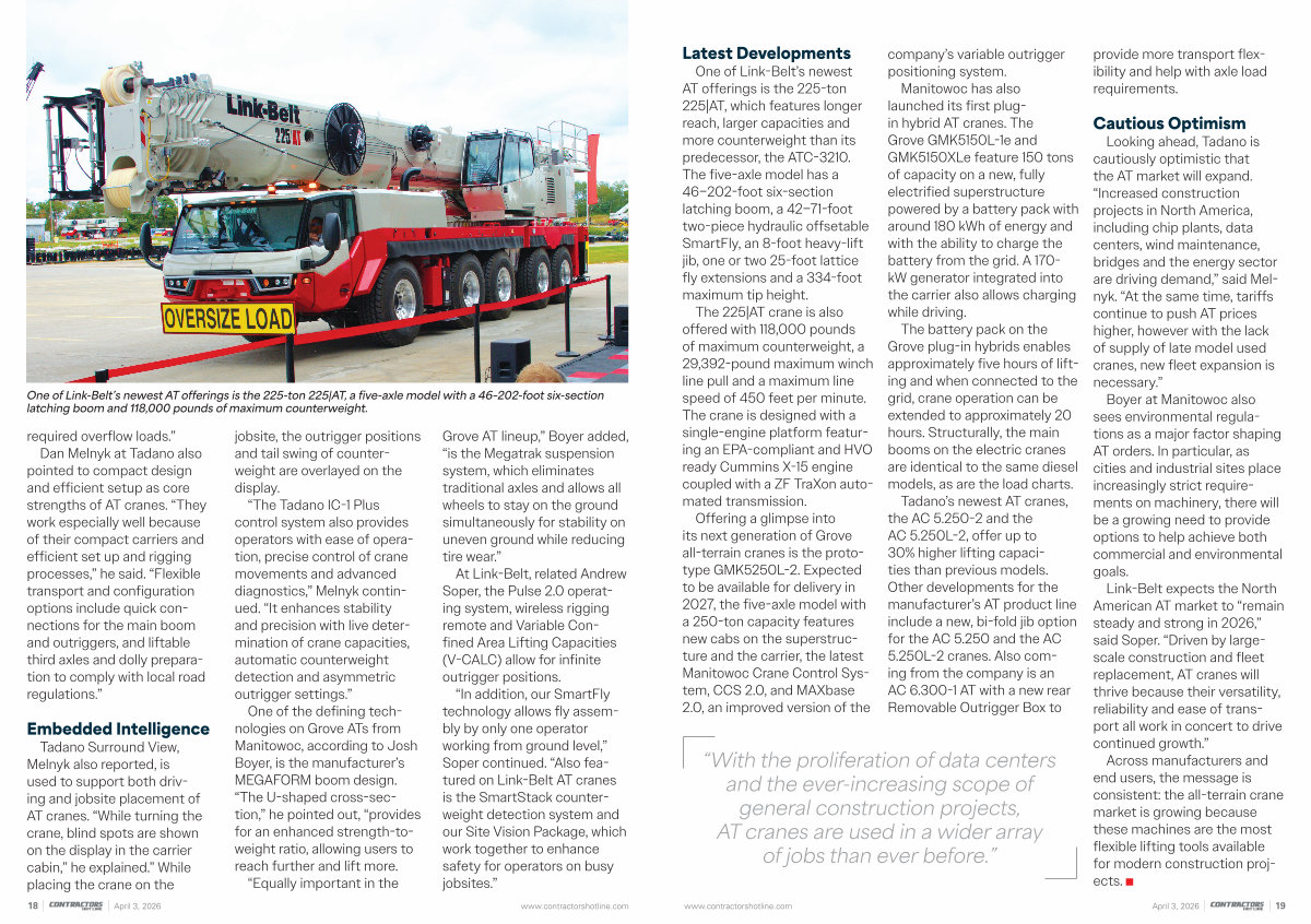 Link-Belt expects the North American AT market to“ remain steady and strong in 2026,” said Soper.“ Driven by largescale construction and fleet replacement, AT cranes will thrive because their versatility, reliability and ease of transport all work in concert to drive continued growth.”