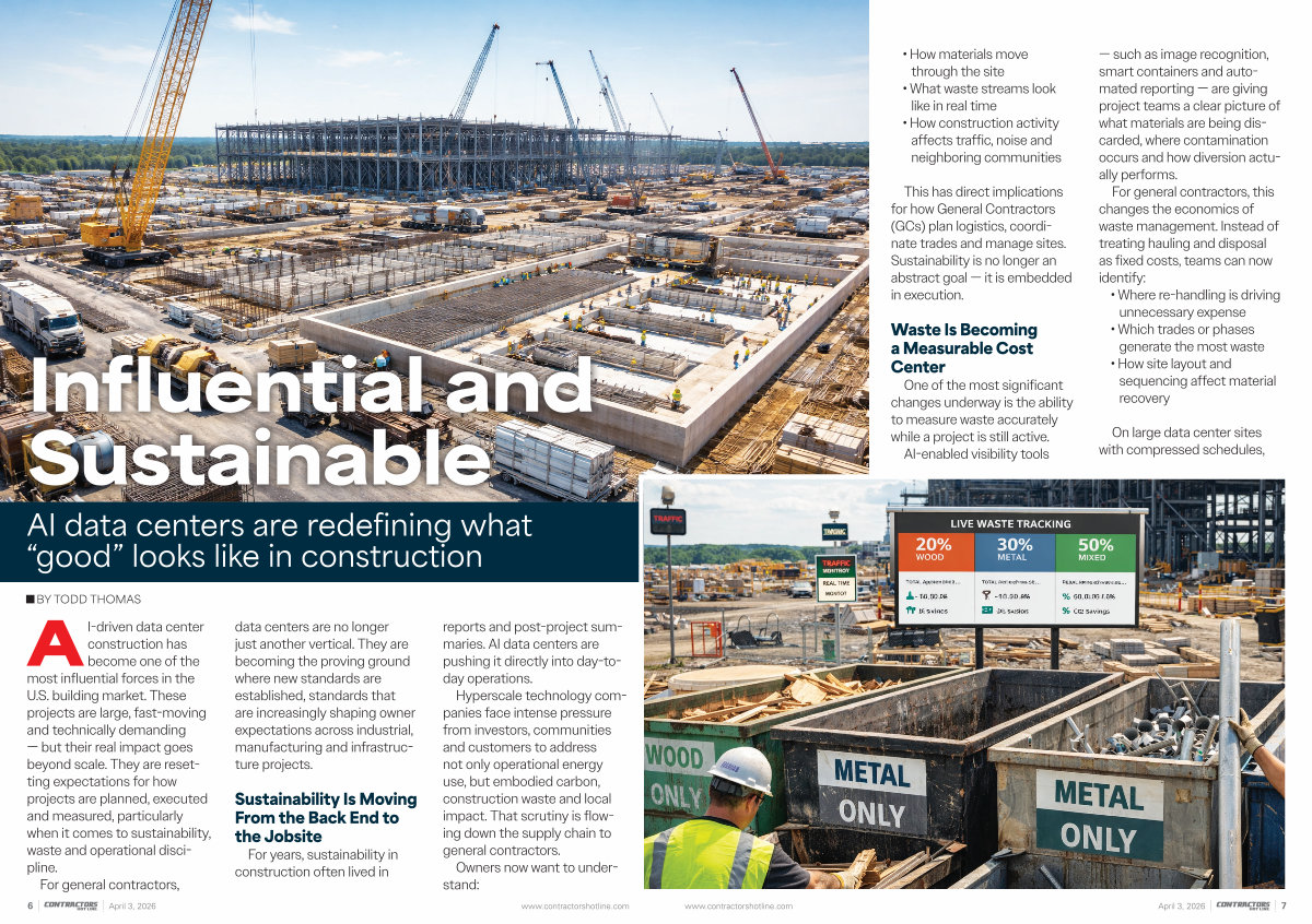 AI-driven data center construction has become one of the most influential forces in the U. S. building market. These projects are large, fast-moving and technically demanding— but their real impact goes beyond scale. They are resetting expectations for how projects are planned, executed and measured, particularly when it comes to sustainability, waste and operational discipline.