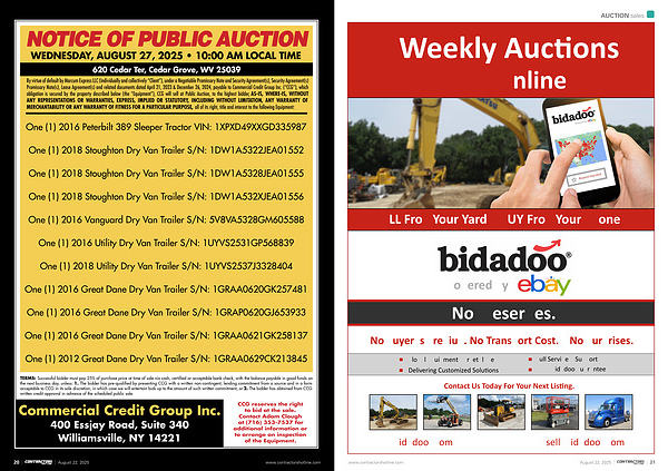 By virtue of default by Marcum Express LLC( Individually and collectively“ Client”), under a Negotiable Promissory Note and Security Agreement( s), Security Agreement( s) Promissory Note( s), Lease Agreement( s) and related documents dated April 21, 2023 & December 26, 2024, payable to Commercial Credit Group Inc.(“ CCG”), which obligation is secured by the property described below( the“ Equipment”), CCG will sell at Public Auction, to the highest bidder, AS-IS, WHERE-IS, WITHOUT ANY REPRESENTATIONS OR WARRANTIES, EXPRESS, IMPLIED OR STATUTORY, INCLUDING WITHOUT LIMITATION, ANY WARRANTY OF MERCHANTABILITY OR ANY WARRANTY OF FITNESS FOR A PARTICULAR PURPOSE, all of its right, title and interest to the following Equipment: