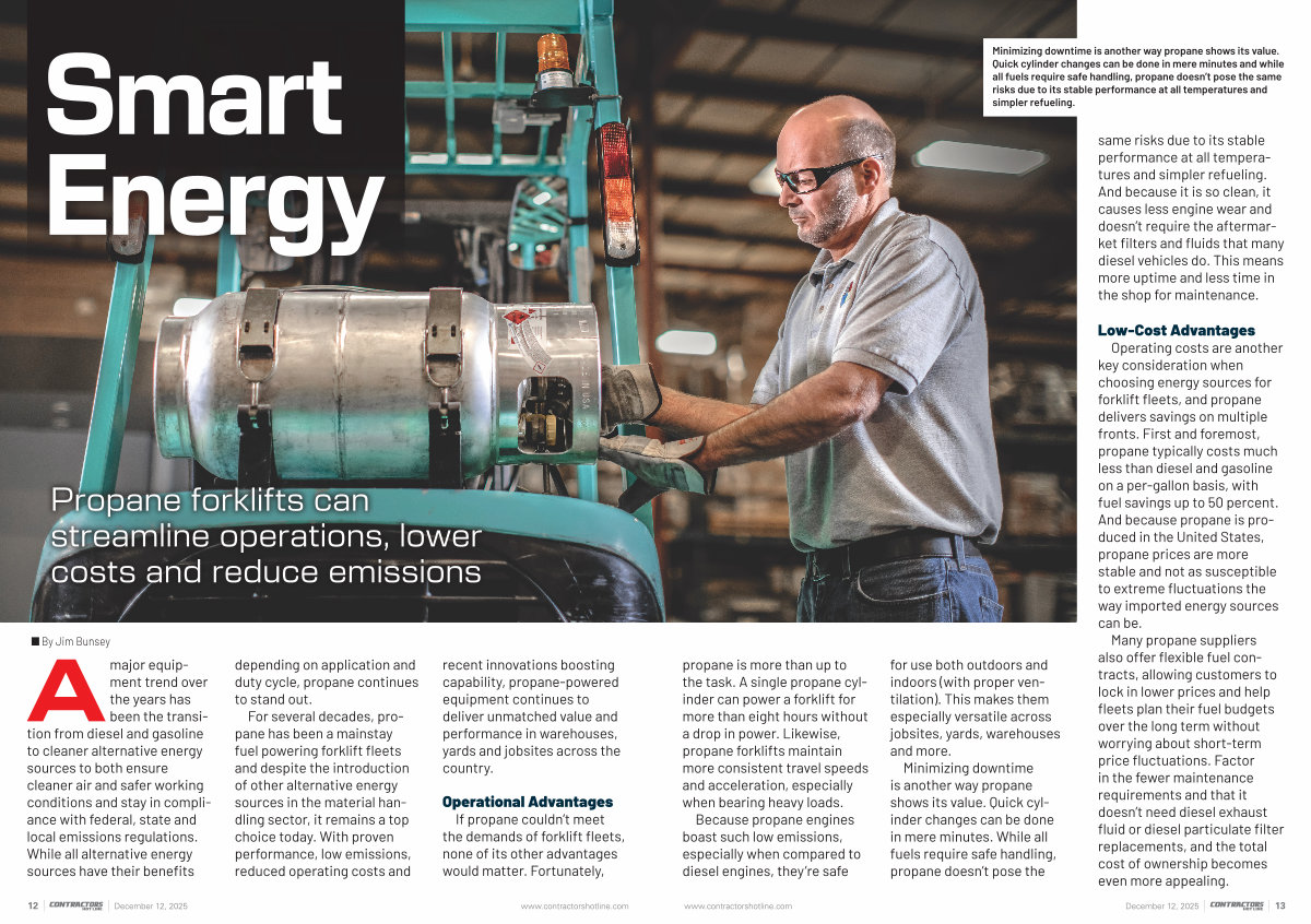 Amajor equipment trend over the years has been the transition from diesel and gasoline to cleaner alternative energy sources to both ensure cleaner air and safer working conditions and stay in compliance with federal, state and local emissions regulations. While all alternative energy sources have their benefits depending on application and duty cycle, propane continues to stand out.