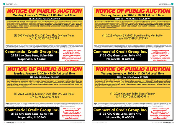 By virtue of default by SARNA TRUCKING INC( Individually and collectively“ Client”), under a Negotiable Promissory Note and Security Agreement( s), Security Agreement( s) Promissory Note( s), Lease Agreement( s) and related documents dated 08 / 11 / 2025, payable to Commercial Credit Group Inc.(“ CCG”), which obligation is secured by the property described below( the“ Equipment”), CCG will sell at Public Auction, to the highest bidder, AS-IS, WHERE-IS, WITHOUT ANY REPRESENTATIONS OR WARRANTIES, EXPRESS, IMPLIED OR STATUTORY, INCLUDING WITHOUT LIMITATION, ANY WARRANTY OF MERCHANTABILITY OR ANY WARRANTY OF FITNESS FOR A PARTICULAR PURPOSE, all of its right, title and interest to the following Equipment: