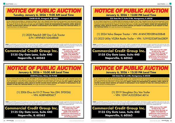 By virtue of default by Dovgal Express Inc. and DOVGAL EXPRESS INC( Individually and collectively“ Client”), under a Negotiable Promissory Note and Security Agreement( s), Security Agreement( s) Promissory Note( s), Lease Agreement( s) and related documents dated May 18, 2023, and August 18, 2023, payable to Commercial Credit Group Inc.(“ CCG”), which obligation is secured by the property described below( the“ Equipment”), CCG will sell at Public Auction, to the highest bidder, AS-IS, WHERE-IS, WITHOUT ANY REPRESENTATIONS OR WARRANTIES, EXPRESS, IMPLIED OR STATUTORY, INCLUDING WITHOUT LIMITATION, ANY WARRANTY OF MERCHANTABILITY OR ANY WARRANTY OF FITNESS FOR A PARTICULAR PURPOSE, all of its right, title and interest to the following Equipment: