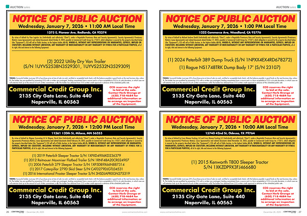 By virtue of default by Pam Logistics Inc( Individually and collectively“ Client”), under a Negotiable Promissory Note and Security Agreement( s), Security Agreement( s) Promissory Note( s), Lease Agreement( s) and related documents dated October 8, 2024, payable to Commercial Credit Group Inc.(“ CCG”), which obligation is secured by the property described below( the“ Equipment”), CCG will sell at Public Auction, to the highest bidder, AS-IS, WHERE-IS, WITHOUT ANY REPRESENTATIONS OR WARRANTIES, EXPRESS, IMPLIED OR STATUTORY, INCLUDING WITHOUT LIMITATION, ANY WARRANTY OF MERCHANTABILITY OR ANY WARRANTY OF FITNESS FOR A PARTICULAR PURPOSE, all of its right, title and interest to the following Equipment: