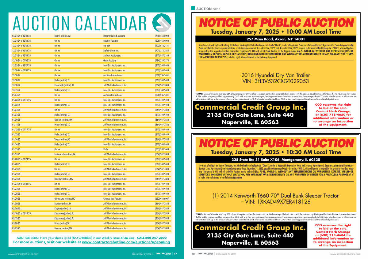 By virtue of default by Matrix Transport, Inc.( Individually and collectively“ Client”), under a Negotiable Promissory Note and Security Agreement( s), Security Agreement( s) Promissory Note( s), Lease Agreement( s) and related documents dated December 21, 2022, payable to Commercial Credit Group Inc.(“ CCG”), which obligation is secured by the property described below( the“ Equipment”), CCG will sell at Public Auction, to the highest bidder, AS-IS, WHERE-IS, WITHOUT ANY REPRESENTATIONS OR WARRANTIES, EXPRESS, IMPLIED OR STATUTORY, INCLUDING WITHOUT LIMITATION, ANY WARRANTY OF MERCHANTABILITY OR ANY WARRANTY OF FITNESS FOR A PARTICULAR PURPOSE, all of its right, title and interest to the following Equipment:
