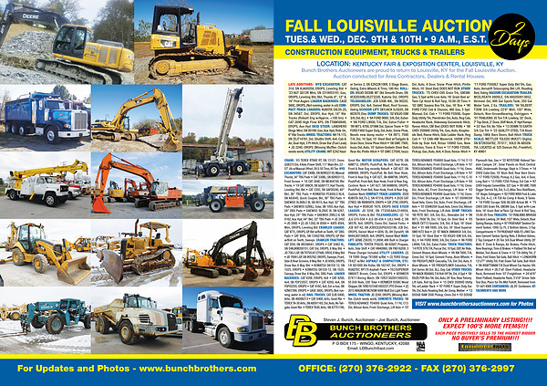 LOCATION: KENTUCKY FAIR & EXPOSITION CENTER, LOUISVILLE, KY Bunch Brothers Auctioneers are proud to return to Louisville, KY for the Fall Louisville Auction. Auction conducted for Area Contractors, Dealers & Rental Houses.