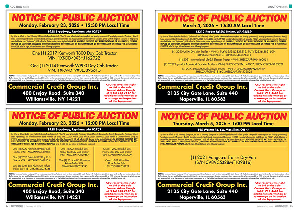 By virtue of default by U. S. Roadways Enterprises, Inc. and US Roadways Enterprises Inc( Individually and collectively“ Client”), under a Negotiable Promissory Note and Security Agreement( s), Security Agreement( s) Promissory Note( s), Lease Agreement( s) and related documents dated December 10, 2024, payable to Commercial Credit Group Inc.(“ CCG”), which obligation is secured by the property described below( the“ Equipment”), CCG will sell at Public Auction, to the highest bidder, AS-IS, WHERE-IS, WITHOUT ANY REPRESENTATIONS OR WARRANTIES, EXPRESS, IMPLIED OR STATUTORY, INCLUDING WITHOUT LIMITATION, ANY WARRANTY OF MERCHANTABILITY OR ANY WARRANTY OF FITNESS FOR A PARTICULAR PURPOSE, all of its right, title and interest to the following Equipment: