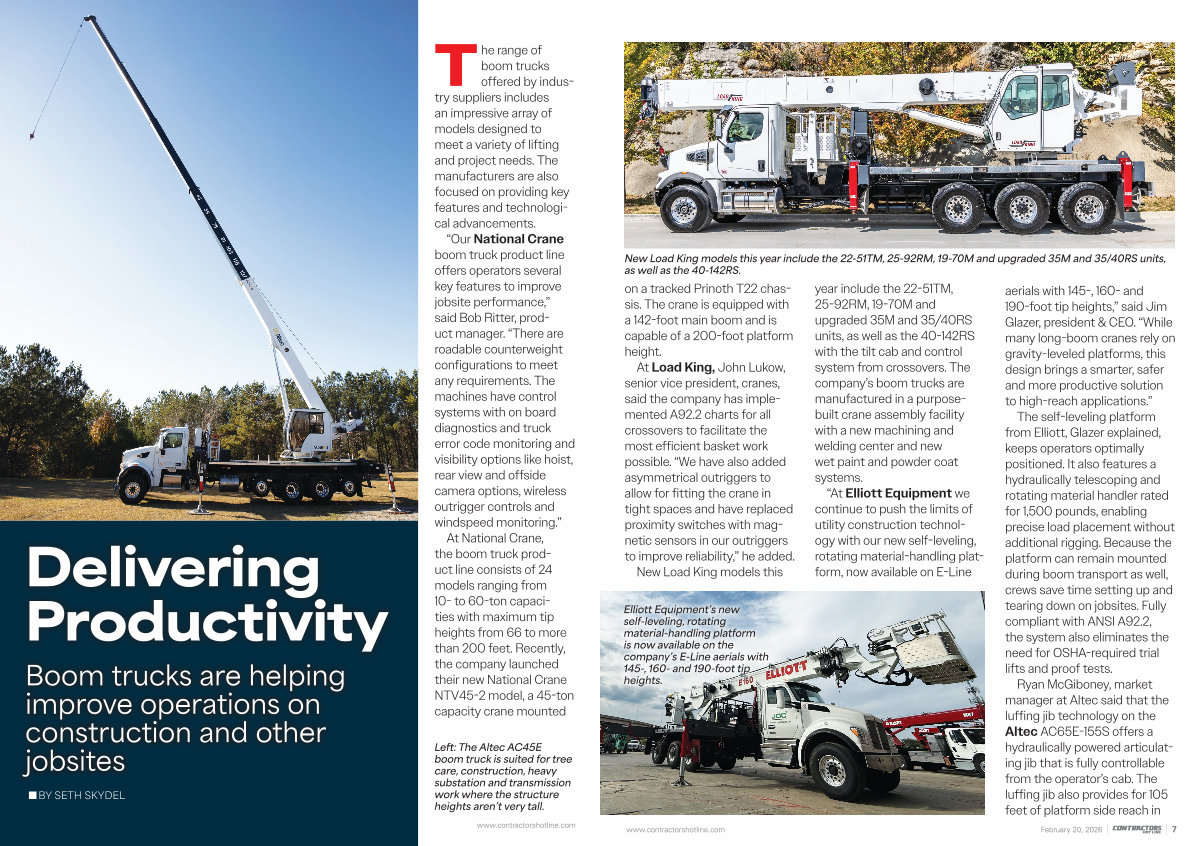 Elliott Equipment’ s new self-leveling, rotating material-handling platform is now available on the company’ s E-Line aerials with 145-, 160- and 190-foot tip heights. year include the 22-51TM, 25-92RM, 19-70M and upgraded 35M and 35 / 40RS units, as well as the 40-142RS with the tilt cab and control system from crossovers. The company’ s boom trucks are manufactured in a purposebuilt crane assembly facility with a new machining and welding center and new wet paint and powder coat systems.
