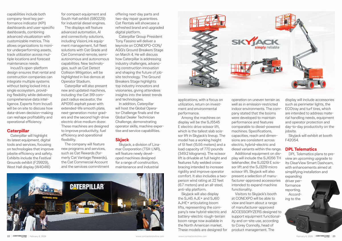 Visitors to Skyjack’ s booth at CONEXPO will be able to view and learn about a range of manufacturer-approved ACCESSORYZERS designed to support equipment functionality and on-site use, according to Corey Connolly, head of product management. The display will include accessories such as perimeter lights, the ECOtray and turf tires, which are intended to address material handling needs, equipment and operator protection and day-to-day productivity on the jobsite.