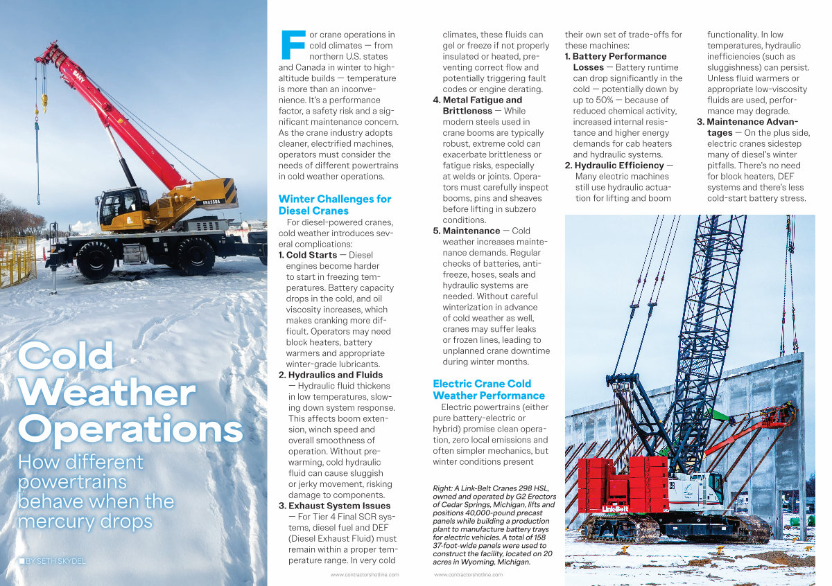 5. Maintenance— Cold weather increases maintenance demands. Regular checks of batteries, antifreeze, hoses, seals and hydraulic systems are needed. Without careful winterization in advance of cold weather as well, cranes may suffer leaks or frozen lines, leading to unplanned crane downtime during winter months.