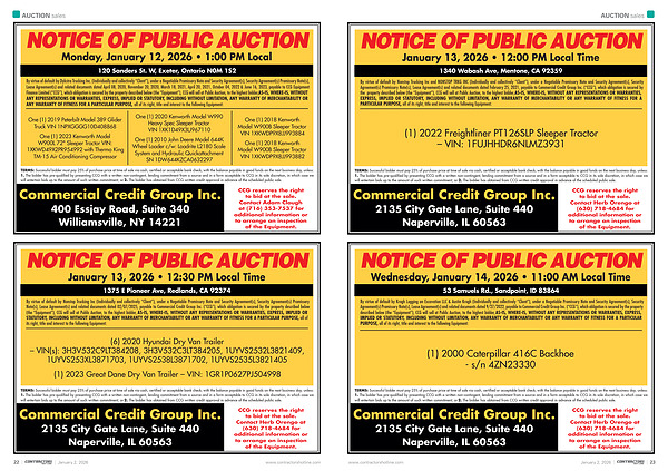 By virtue of default by Nonstop Trucking Inc and NONSTOP TRKG INC( Individually and collectively“ Client”), under a Negotiable Promissory Note and Security Agreement( s), Security Agreement( s) Promissory Note( s), Lease Agreement( s) and related documents dated February 25, 2021, payable to Commercial Credit Group Inc.(“ CCG”), which obligation is secured by the property described below( the“ Equipment”), CCG will sell at Public Auction, to the highest bidder, AS-IS, WHERE-IS, WITHOUT ANY REPRESENTATIONS OR WARRANTIES, EXPRESS, IMPLIED OR STATUTORY, INCLUDING WITHOUT LIMITATION, ANY WARRANTY OF MERCHANTABILITY OR ANY WARRANTY OF FITNESS FOR A PARTICULAR PURPOSE, all of its right, title and interest to the following Equipment: