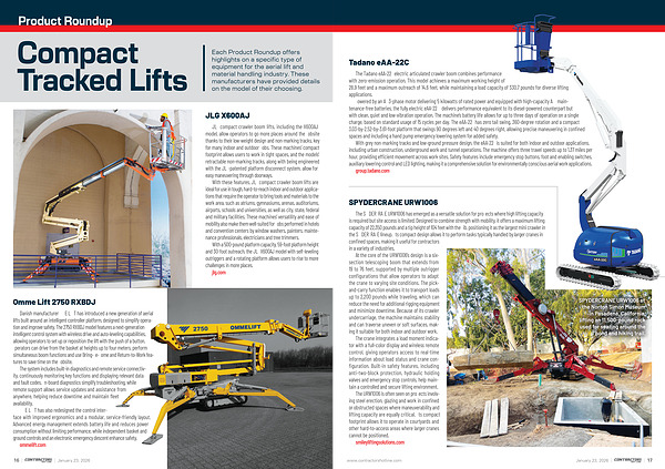 With grey non-marking tracks and low-ground pressure design, the eAA-22C is suited for both indoor and outdoor applications, including urban construction, underground work and tunnel operations. The machine offers three travel speeds up to 1.37 miles per hour, providing efficient movement across work sites. Safety features include emergency stop buttons, foot and enabling switches, auxiliary lowering control and LED lighting, making it a comprehensive solution for environmentally conscious aerial work applications. group. tadano. com