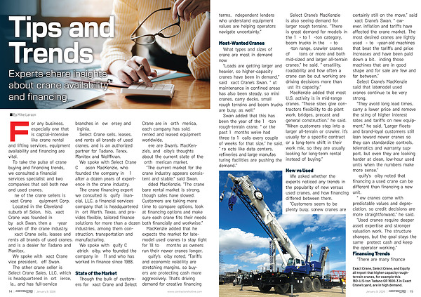 “ Customers seem to be plenty busy, so new cranes are certainly still on the move,” said Exact Crane’ s Swan.“ However, inflation and tariffs have affected the crane market. The most desired cranes are lightly used 2- to 5-year-old machines that beat the tariffs and price increases and have been paid down a bit. Finding those machines that are in good shape and for sale are few and far between.”