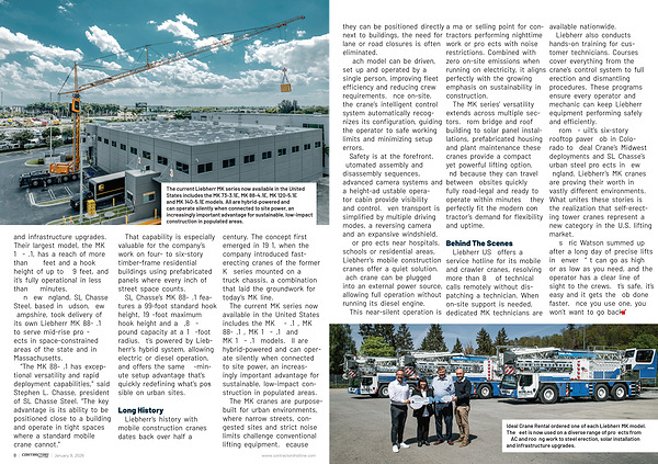 From E-Built’ s six-story rooftop paver job in Colorado to Ideal Crane’ s Midwest deployments and SL Chasse’ s urban steel projects in New England, Liebherr’ s MK cranes are proving their worth in vastly different environments. What unites these stories is the realization that self-erecting tower cranes represent a new category in the U. S. lifting market.