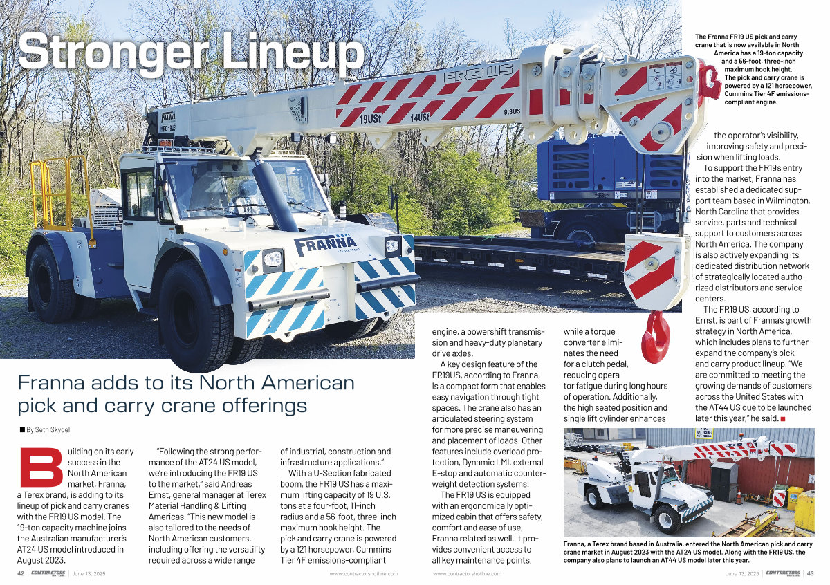 The FR19 US, according to Ernst, is part of Franna’ s growth strategy in North America, which includes plans to further expand the company’ s pick and carry product lineup.“ We are committed to meeting the growing demands of customers across the United States with the AT44 US due to be launched later this year,” he said.