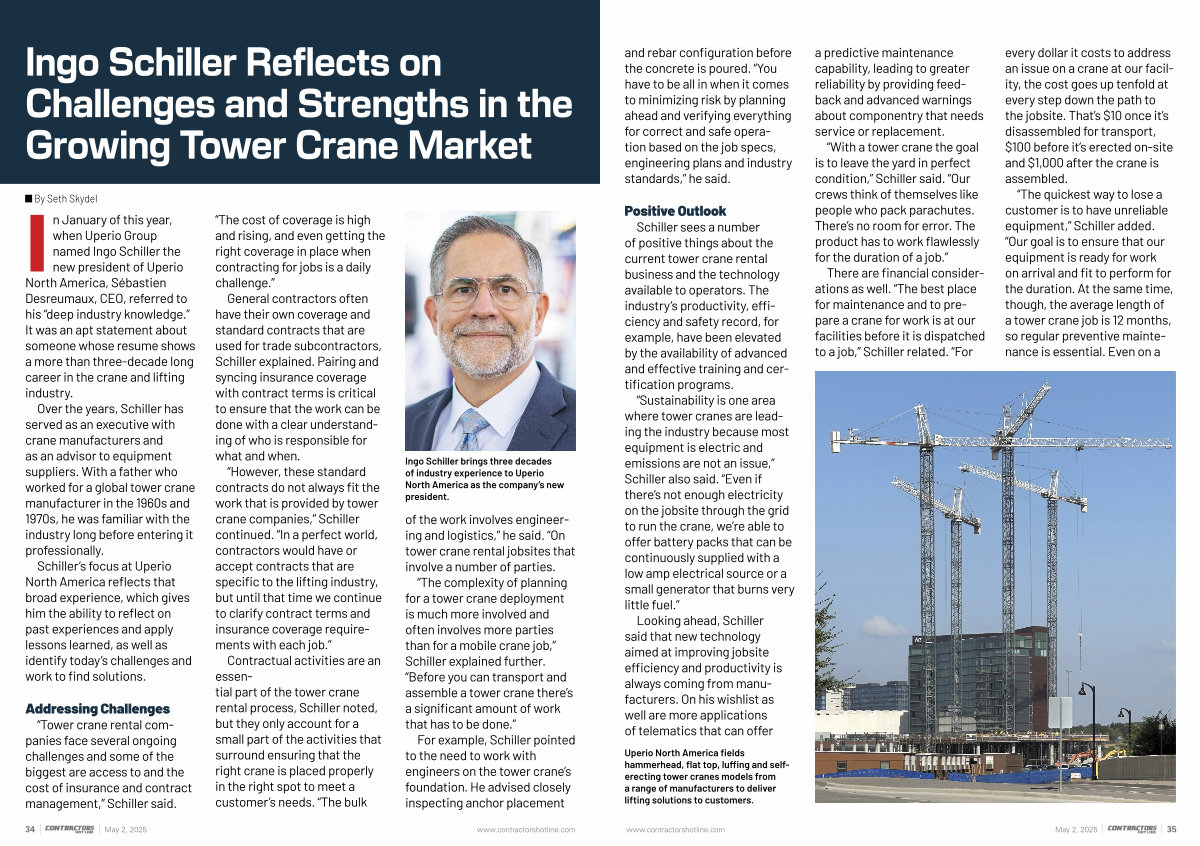 In January of this year, when Uperio Group named Ingo Schiller the new president of Uperio North America, Sébastien Desreumaux, CEO, referred to his“ deep industry knowledge.” It was an apt statement about someone whose resume shows a more than three-decade long career in the crane and lifting industry.