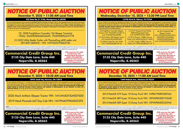 By virtue of default by Proselyte Trucking Co., Inc.; Proselyte Trkg Co Inc; Proselyte Trucking Co Inc( Individually and collectively“ Client”), under a Negotiable Promissory Note and Security Agreement( s), Security Agreement( s) Promissory Note( s), Lease Agreement( s) and related documents dated September 4, 2024, payable to Commercial Credit Group Inc.(“ CCG”), which obligation is secured by the property described below( the“ Equipment”), CCG will sell at Public Auction, to the highest bidder, AS-IS, WHERE-IS, WITHOUT ANY REPRESENTATIONS OR WARRANTIES, EXPRESS, IMPLIED OR STATUTORY, INCLUDING WITHOUT LIMITATION, ANY WARRANTY OF MERCHANTABILITY OR ANY WARRANTY OF FITNESS FOR A PARTICULAR PURPOSE, all of its right, title and interest to the following Equipment: