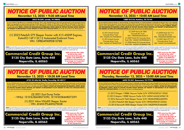 By virtue of default by Crazy Woman Trucking, LLC and Crazy Woman Trucking LLC( Individually and collectively“ Client”), under a Negotiable Promissory Note and Security Agreement( s), Security Agreement( s) Promissory Note( s), Lease Agreement( s) and related documents dated November 23, 2022 and March 18, 2025, payable to Commercial Credit Group Inc.(“ CCG”), which obligation is secured by the property described below( the“ Equipment”), CCG will sell at Public Auction, to the highest bidder, AS-IS, WHERE-IS, WITHOUT ANY REPRESENTATIONS OR WARRANTIES, EXPRESS, IMPLIED OR STATUTORY, INCLUDING WITHOUT LIMITATION, ANY WARRANTY OF MERCHANTABILITY OR ANY WARRANTY OF FITNESS FOR A PARTICULAR PURPOSE, all of its right, title and interest to the following Equipment: