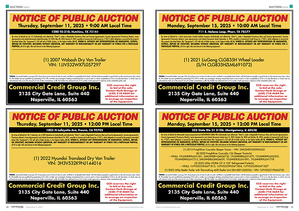 By virtue of default by Nationwide Cargo Incorporated and NATIONWIDE CARGO INC( Individually and collectively“ Client”), under a Negotiable Promissory Note and Security Agreement( s), Security Agreement( s) Promissory Note( s), Lease Agreement( s) and related documents dated June 15, 2023, October 26, 2023 and October 26, 2023, payable to Commercial Credit Group Inc.(“ CCG”), which obligation is secured by the property described below( the“ Equipment”), CCG will sell at Public Auction, to the highest bidder, AS-IS, WHERE-IS, WITHOUT ANY REPRESENTATIONS OR WARRANTIES, EXPRESS, IMPLIED OR STATUTORY, INCLUDING WITHOUT LIMITATION, ANY WARRANTY OF MERCHANTABILITY OR ANY WARRANTY OF FITNESS FOR A PARTICULAR PURPOSE, all of its right, title and interest to the following Equipment: