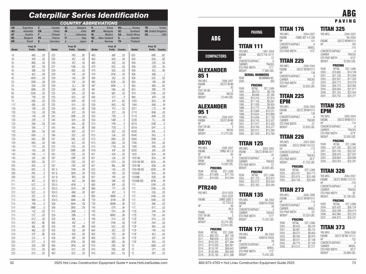 YRS MFG.......... 2003-2005 ENGINE... DEUTZ BF6M 1013 EC HP..................... 173 CONCRETE / ASPHALT......... A CARRIER............. TRACKS STD PAVE WIDTH......... 26’ 3” WEIGHT........... 31,752 LBS. PRICING YEAR RETAIL EST. LOAN 2003..........$ 33,031.......... $ 24,773 2004..........$ 33,878.......... $ 25,409 2005..........$ 34,746.......... $ 26,060