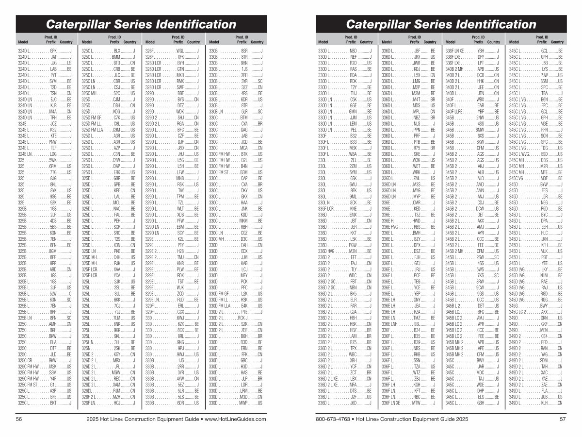 325C L.......... BLX............ J 325C L......... BMM............ J 325C L.......... BTD.......... CN 325C L.......... CRB.......... BE 325C L.......... JLC.......... BE 325C LN........ CBR.......... US 325C LN........ CSJ.......... BE 325C MH........ S2C.......... US 325D........... CJM............ J 325D........... DBH.......... CN 325D........... KDG............ J 325D FM GF...... C7K.......... US 325D FM LL...... C8L.......... US 325D FM LLA..... C9M.......... US 325D L.......... A3R.......... US 325D L.......... A3R.......... US 325D L.......... AZP............ J 325D L.......... C3N.......... BE 325D L.......... CYW............ J 325D L.......... DAP............ J 325D L.......... ERK.......... US 325D L.......... GBR.......... BE 325D L.......... GPB.......... BE 325D L.......... KBE.......... CN 325D L.......... LAL.......... BE 325D L.......... MCL.......... BE 325D L.......... NAC.......... BE 325D L.......... PAL.......... BE 325D L.......... PEH............ J 325D L.......... SCR............ J 325D L.......... SRC.......... BE 325D L.......... T2S.......... BE 325D L.......... X3N.......... CN 325D LN........ PKE.......... BE 325D MH........ C4H.......... US 325D MH........ RJK.......... US 325F LCR........ XAA............ J 325F LCR........ YCA............ J 325L........... 2JK.......... US 325L........... 2SL.......... BE 325L........... 3LL.......... BE 325L........... 6KK............ J 325L........... 7CJ............ J 325L........... 7LJ.......... BE 325L........... 7LM.......... US 325L........... 8NK.......... US 325L........... 9KK............ J 325L........... 9KL............ J 325L N.......... 3LL.......... BE 325N........... 2SK.......... BE 326D 2......... KGY.......... CN 326D 2 L........ MBX............ J 326D 2 L........ JFL............ J 326D 2 L....... MGW.......... CN 326D 2 L........ REC.......... CN 326D 2 L........ XAM.......... CN 326DL.......... PJM.......... CN 326F 2 L........ MZH.......... CN 326F LN......... HCJ............ J