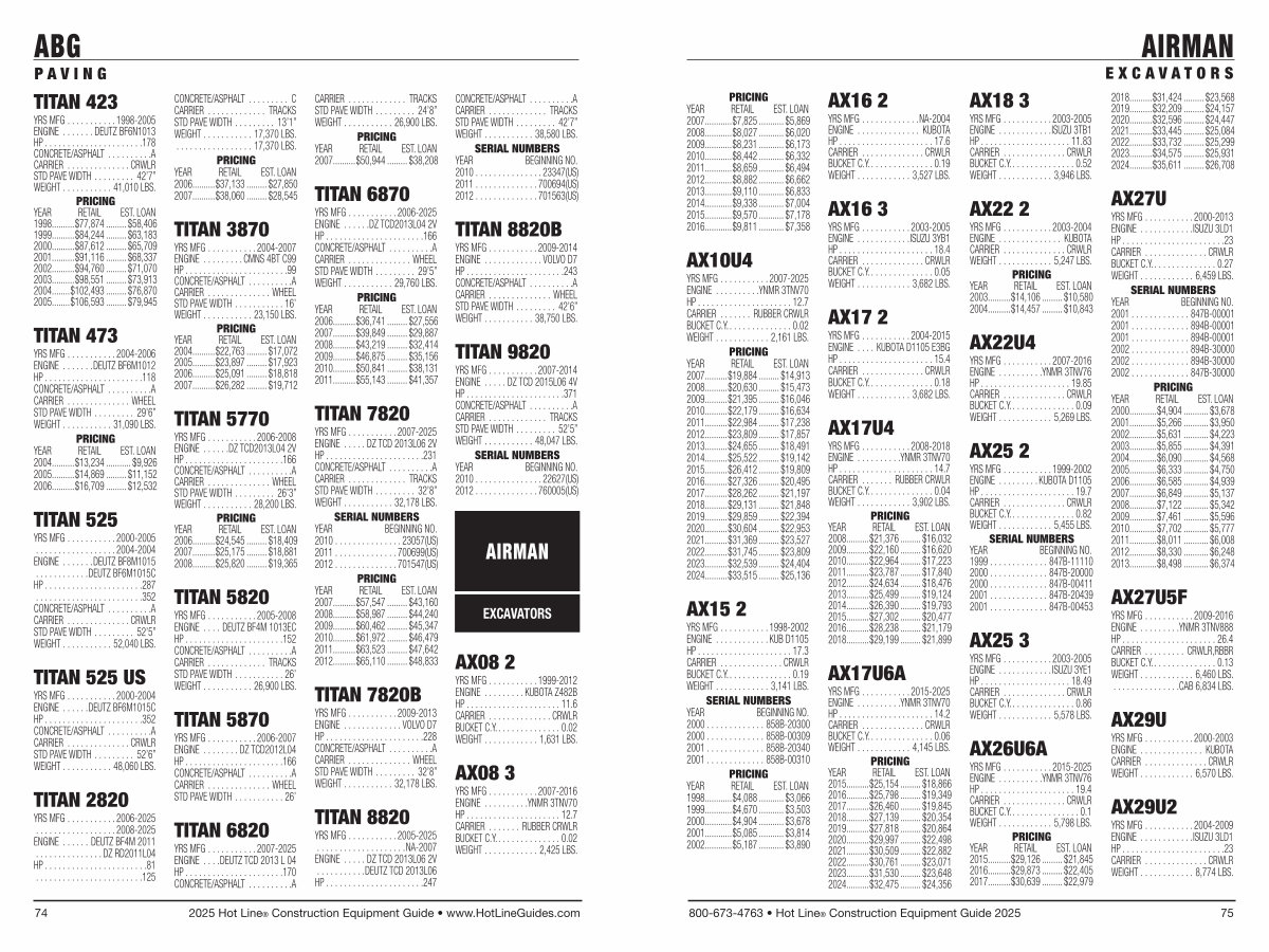 YRS MFG.......... 2003-2004 ENGINE.............. KUBOTA CARRIER............. CRWLR WEIGHT............ 5,247 LBS. PRICING YEAR RETAIL EST. LOAN 2003..........$ 14,106.......... $ 10,580 2004..........$ 14,457.......... $ 10,843