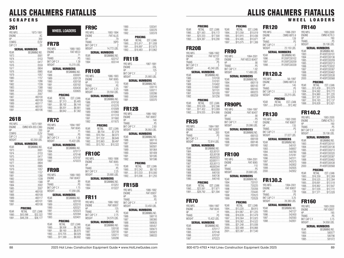 YRS MFG.......... 1988-1993 ENGINE............ FIAT IVECO HP...................... 71 TRANS................... PS BKT CAP C. Y.............. 1.38 WEIGHT........... 15,270 LBS. SERIAL NUMBERS YEAR BEGINNING NO. 1988................. 630001 1989................. 630129 1990................. 630158 1991................. 630182 1992................. 630430 1993................. 630605