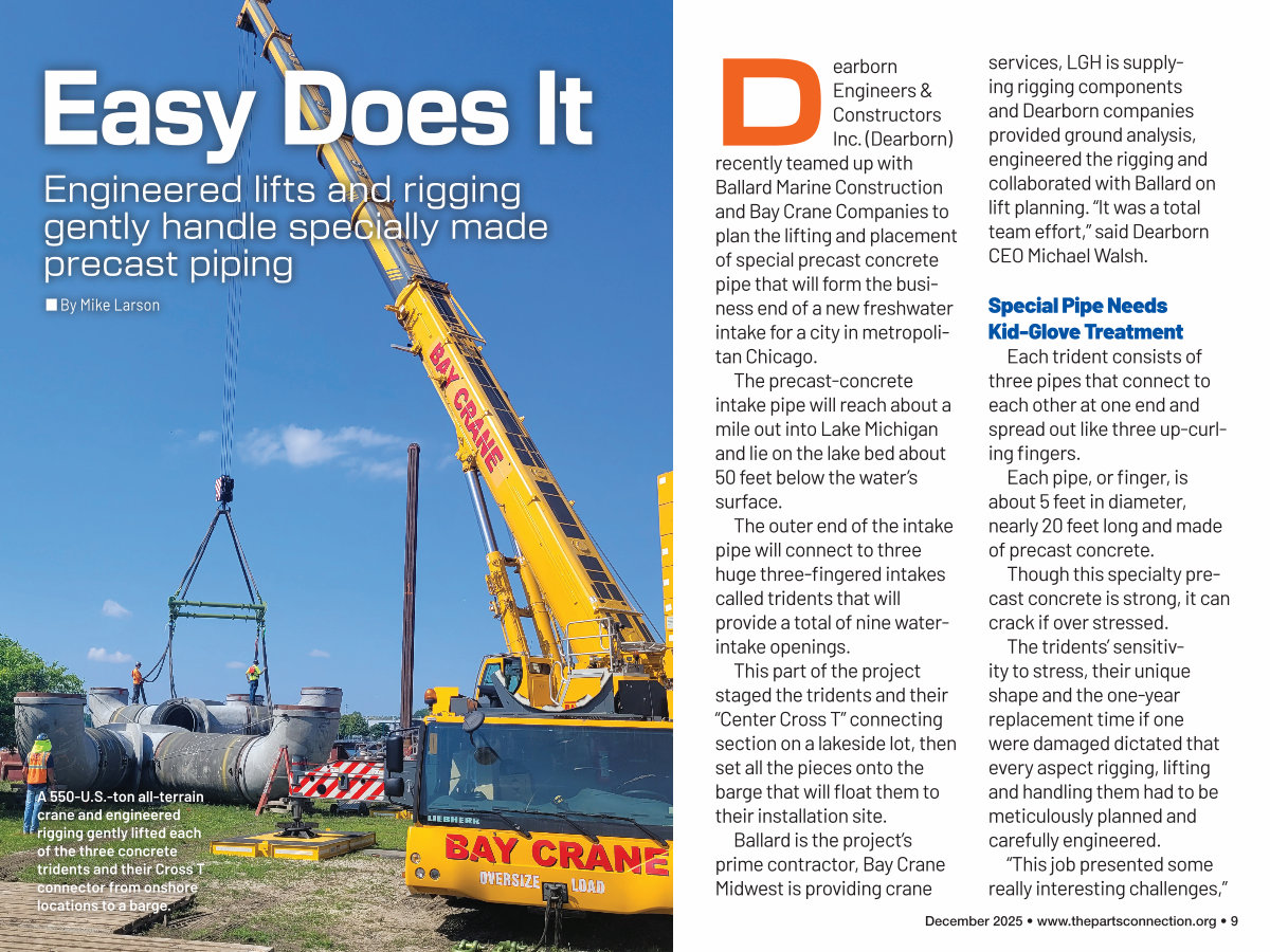 A 550-U. S.-ton all-terrain crane and engineered rigging gently lifted each of the three concrete tridents and their Cross T connector from onshore locations to a barge.