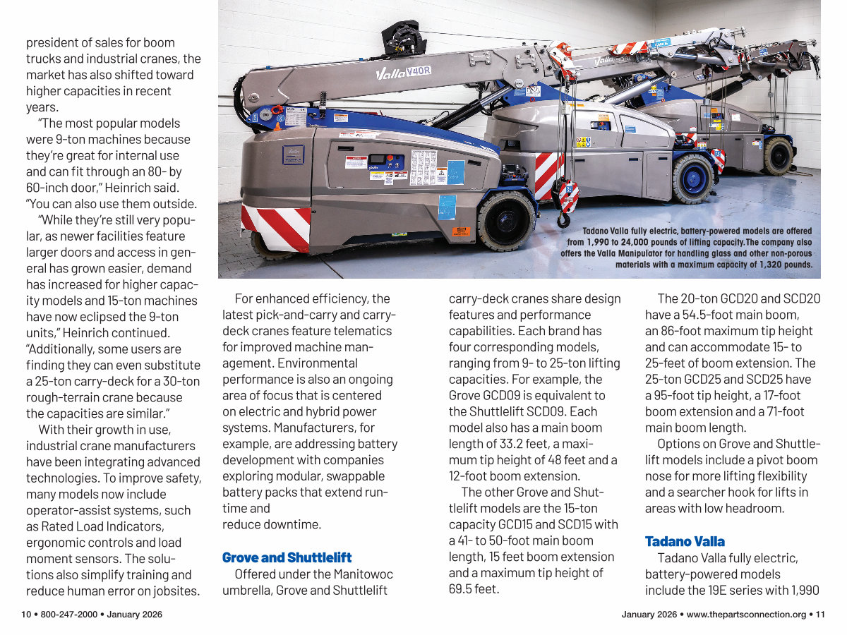 “ While they’ re still very popular, as newer facilities feature larger doors and access in general has grown easier, demand has increased for higher capacity models and 15-ton machines have now eclipsed the 9-ton units,” Heinrich continued.“ Additionally, some users are finding they can even substitute a 25-ton carry-deck for a 30-ton rough-terrain crane because the capacities are similar.”