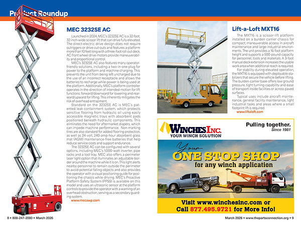 The 3232SE AC can be configured with several options, including MEC’ s 1,000-watt inverter, pipe racks and a tool tray. MEC also offers a perimeter laser light option that illuminates an adjustable border around the machine while it is on. This light alerts nearby personnel to remain outside the perimeter to avoid potential falling objects and also provides the operator with a visual positioning guide for positioning the chassis while driving. MEC’ s Proactive Platform Safety System( PPSS) is available on this model and uses an ultrasonic sensor at the platform controls to provide the operator with a warning of an overhead obstruction, serving as a secondary guarding system. www. mecawp. com