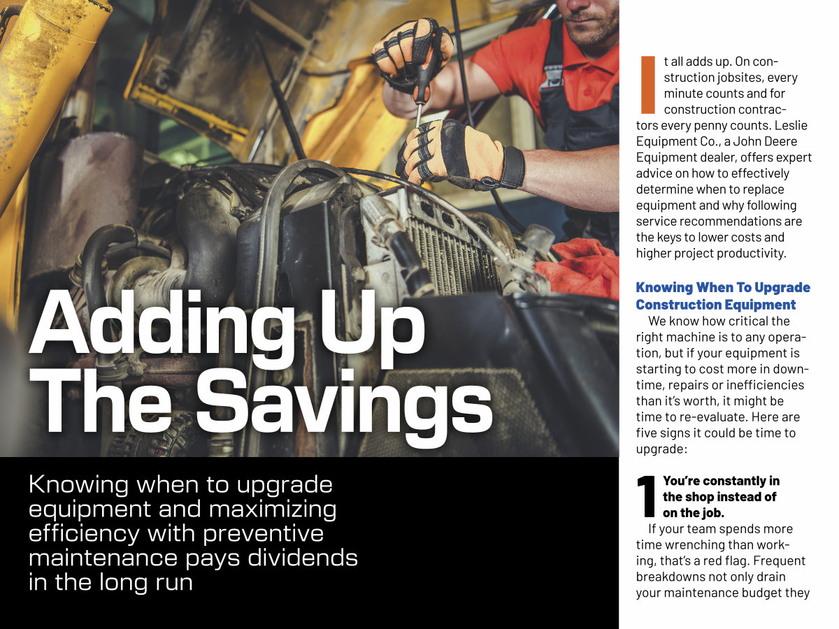 It all adds up. On construction jobsites, every minute counts and for construction contractors every penny counts. Leslie Equipment Co., a John Deere Equipment dealer, offers expert advice on how to effectively determine when to replace equipment and why following service recommendations are the keys to lower costs and higher project productivity. s